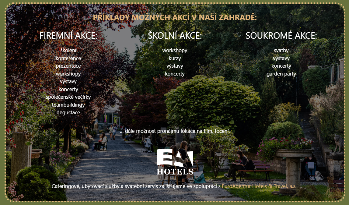 Umělecká zahrada je unikátním místem téměř v centru Prahy (v Nuslích pod Vyšehradem) s jedinečným geniem loci. Je klidnou kvetoucí oázou uprostřed metropole. Právě zde můžete uspořádat svoji soukromou či firemní akci, ať již je to svatba, garden party, konference, prezentace, koncert, společenský večírek, degustace, výstava apod.