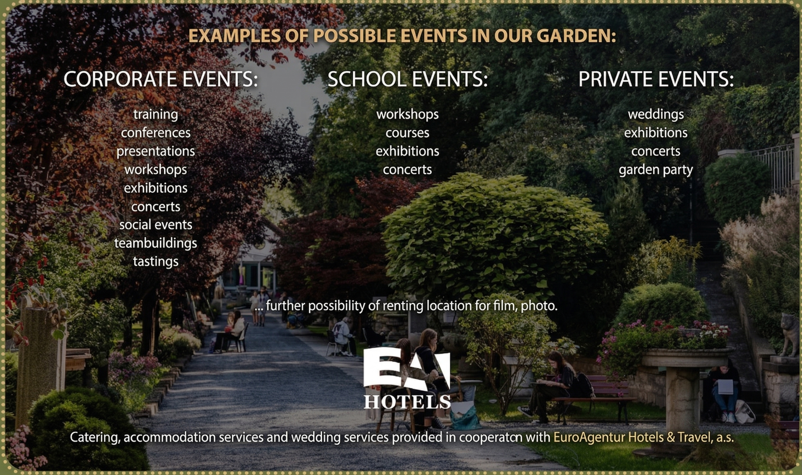 The Art Garden is a unique venue near the heart of Prague (in Nusle, below Vyšehrad) with a singular genius loci. It is a peaceful, blooming oasis in the middle of the metropolis. This is the perfect place to host your private or corporate event, whether it is a wedding, garden party, conference, presentation, concert, social gala, tasting, exhibition, or more.